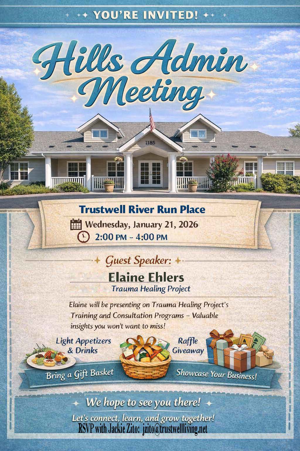 Join us at Trustwell River Run Place for our upcoming Hills Admin Meeting on Wednesday, January 21, 2026, from 2:00 PM to 4:00 PM. This month’s meeting will feature Guest Speaker: Elaine Ehlers from the Trauma Healing Project. Elaine will share insights into Trauma Healing Project’s Training and Consultation Programs—valuable information you won’t want to miss.
