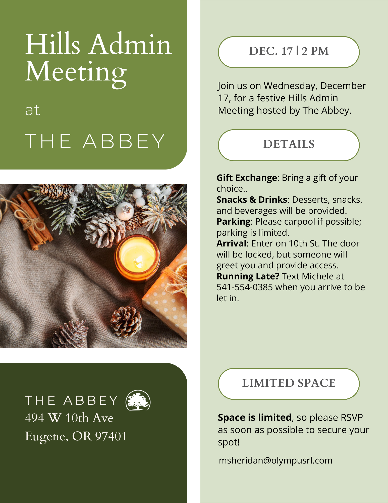 You’re invited to a festive Hills Admin Meeting hosted at The Abbey! 📅 Wednesday, December 17 Join us for an afternoon of connection, treats, and holiday cheer. What to expect: 🎁 Gift Exchange – Bring a gift of your choice 🍰 Snacks & Drinks – Desserts, snacks, and beverages will be provided