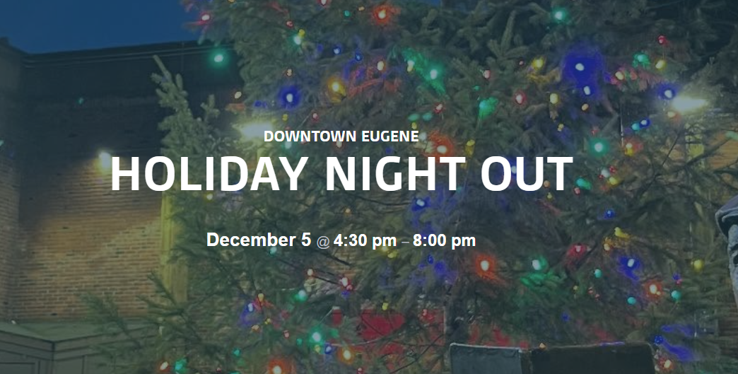 The Downtown Eugene Holiday Night Out returns! Presented by Downtown Eugene Merchants and our community partners, the Holiday Night Out is your opportunity to come out a little later than usual and explore all that downtown has to offer. Shops across Downtown Eugene will be open late, serving up refreshments, sales, entertainment and more to get you into the holiday spirit. This year’s Holiday Night Out is happening alongside Lane Arts Council’s First Friday ArtWalk. There will be something for everyone!