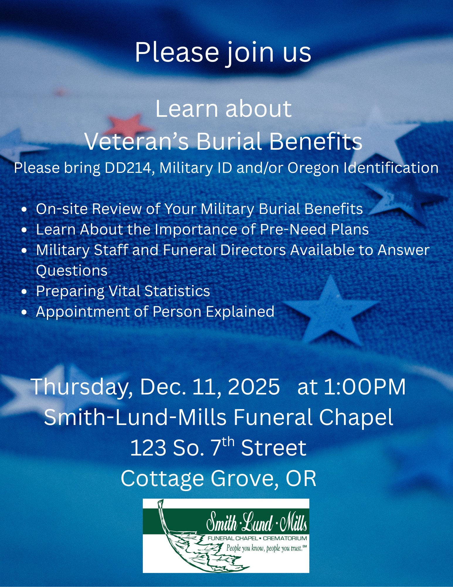 Join us for an informative session dedicated to helping veterans and their families understand the burial benefits available to them. Military staff and licensed funeral directors will be on-site to answer questions and provide personalized guidance. Attendees are encouraged to bring their DD214, Military ID, and/or Oregon Identification for an on-site review of benefits.